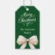 Un fond vert, du texte crème et de l'arc. Joyeux Noël est écrit avec un élégant script de style manuscrit. Personnalisez et ajoutez votre nom de famille. Retour : arrière - plan couleur crème, espace pour que vous écriviez à la main.