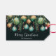 Étiquettes de cadeaux de fête de Noël élégantes avec des branches de pin, des ornements de boule de Noël verte et or et des rubans sur un fond vert foncé avec vos détails en lettrage chic, parfait pour vos faveurs de rassemblement de fêtes de fin d'année ou pour vos cadeaux. ARTICLES CORRESPONDANTS dans notre collection.