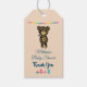 Une étiquette cadeau de remerciement pour un baby shower. Conçu avec un adorable dessin d'un ours brun sympathique tenant une fleur jaune. Une banderole multicolore en haut et le long du fond sont des cadeaux emballés et des douceurs sucrées.