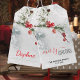 Un détail d'aquarelle peinte branche de pin sprig et des baies rouges dans une tempête de neige met en évidence cette étiquette cadeau de Noël joyeux qui comprend un nom et une option date/année.