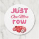 Playful knitting quote design featuring “Just One More Row” in chunky pink knit-style letters above a pile of pink and red yarn balls with knitting needles. Perfect for passionate knitters, crocheters, and yarn lovers who can never stop stitching. Great for cozy crafting vibes on everyday items.