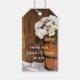Attachez le charmant seau en bois et les marguerites blanches Country Barn Wedding Favor Tag aux faveurs de la fête à votre décontractée et classe ranch western style nuptiale douche ou réception de mariage pour remercier vos invités d'y avoir assisté. Ces étiquettes de faveur rustiques chic et personnalisées présentent une photo fleurie numériquement rehaussée d'un seau en bois rempli de fleurs de marguerite blanche et d'un arrière - plan en bois de grange patiné brun. Idéal pour un événement informel de fête de la ferme.