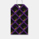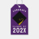Étiquettes de cadeaux de fin d'études créatives avec un design de félicitations au diplômé, avec une casquette noire et un gland doré sur fond violet. Modifiez le texte pour ajouter l'année.