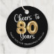 Balise Favor ronde Merci de ballon à 80 ans. Utilisez ces étiquettes de faveur festives et personnalisées pour joindre à vos faveurs de fête pour remercier vos invités d'avoir célébré votre invité d'honneur à une fête du 80e anniversaire. Ces autocollants de couleurs personnalisées ont un design CHEERS TO 80 YEARS avec des numéros de ballon d'or en faux métal et la typographie de script moderne et votre message personnalisé ci-dessous (l'exemple dit MERCI FOR FLEBRATING With US!). L'exemple montre du texte blanc sur un arrière - plan noir ; vous pouvez modifier le texte et les couleurs arrière - plans pour les coordonner avec les couleurs de votre thème de soirée dans EDIT. ASSISTANCE : Pour obtenir de l'aide sur la modification ou la personnalisation de la conception ou pour coordonner des éléments, contactez le concepteur AVANT de commander par Zazzle Conversation ou par courriel makeitaboutyoustore@gmail.com.