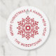 Simple et moderne marque ronde de Noël en rouge et blanc présente un nom de famille et une phrase de bienvenue personnalisés : "Joyeux Noël & une Bonne Année." L'arrière est ornée d'un élégant motif de flocon de neige et comprend de l'espace pour le nom du récipiendaire. Ajoutez une touche personnelle et élégante à vos fêtes de vacances grâce à ces étiquettes cadeaux élégantes de flocon de neige © y.BEE PAPERIE