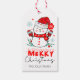 Une étiquette cadeau de bonhomme de neige mignonne avec Joyeux Noël, des flocons de neige et le dessin de chapeau de Père Noël.