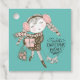 Illustration à la main et à l'effigie d'une fille équipée d'hiver, portant un cadeau de Noël, marchant avec son chien, et un texte courbe "Souhaits de Noël doux". Arrière - plan Aqua.
