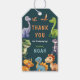 Un Merci d'anniversaire de dinosaure Tag est un invitation de fête à thème avec des graphiques amusants de dinosaures, des couleurs audacieuses et des textes ludiques comme "Stomp, Chomp, et Roar!" Les dessins populaires sont composés de dinosaures de dessins animés, d'arrière - plans d'inspiration fossile ou de paysages de jungle. Parfaits pour les enfants qui aiment les dinosaures, ils donnent le ton d'une fête préhistorique sur le thème de l'aventure !