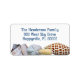 Junonia coquille des étiquettes de adresse. Les coquillages tropicaux comprennent la junonia tachetée, la coquille de cône, les biscuits de mer et le dollar, et le buccin éclairant. Tous sont populaires avec les beachcombers en Floride. Nom et adresse en noir, texte de script sur un arrière - plan blanc.