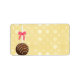 © 2012 Socialite Designs. Goutte de gâteau Whimsical avec étiquettes design arc. L'arrière - plan a un motif à pois doux jaune. Parfait pour ajouter votre nom d'entreprise de boulangerie et vos coordonnées, et utiliser comme étiquettes d'emballage de produits.