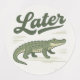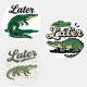 Illustration amusante et stylisée d'un crocodile vert avec des taches noires et un dessous pâle, posé dans une position incurvée avec sa queue s'étendant vers le bas. Au-dessus du crocodile, le mot "Plus tard" est écrit en gras, noir cursif, ajoutant un ton décontracté et humoristique à l'image. L’ombre du crocodile fonde la composition, tandis que l’arrière - plan blanc propre garde l’accent sur le caractère et le texte. Ce design allie habilement charme visuel et message d'adieu ludique.