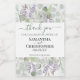 Ces beaux étiquettes de mini vin sont parfaits pour ajouter des esprits festifs à un sac de swag mariage, remercier les membres de votre fête de mariage, ou dans le cadre de votre bar de réception. Le design rustique présente un style boho chic avec des sprigs d'aquarelle feuilles eucalyptus et des fleurs de lavande dans les tons vert sauge et violet clair. Le texte dit "merci de célébrer avec nous" avec le nom du couple, la date du mariage et le type de vin ou de bouteille contenu.