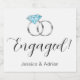Ces étiquettes de vin pétillant sur mesure disent Engaged! avec une paire d'anneaux de fiançailles en diamant bleu argenté, et les noms de mariés et mariés. Parfait pour une fête de fiançailles !