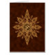 Un symbole d'Aum ou de l'OM se repose à l'intérieur de d'une conception élaborée du soleil. L'étoile se compose de huit rayons stylisés qui s'étendent comme des rais d'un cercle au centre. Les lignes et les points complexes sont colorés avec un jaune d'or qui est accentué pour donner au motif un éclat léger sur la surface. L'arrière - plan est peint brun-foncé qui peut être vu par l'espace négatif du soleil. Une ombre apparaît juste sous la conception le faisant semblent flotter juste au-dessus de la surface de la carte. Cette conception élégante est une représentation saisissante de ce symbole spirituel.