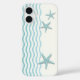 Un étui de scène de plage abstrait amusant avec des lignes turquoises ondulées qui représentent le surf avec un éparpillement d'étoiles de mer le long du bord du surf. Conçu pour iPhone.