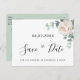 A modern Save the Date card for a wedding. On the front: A chic white background decorated with green watercolored eucalyptus greenery, leaves and sprigs and a white watercolored peony, flower floral. Personalize and add your names and the date. Black coloured letters. The text: Save the Date is written with a large trendy hand lettered style script.