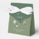 An eucaluptus and sage favorbox with a white Ribbon. Customizable text (names and date) front and back. An Eucaluptus branch with the skriptfont with glyph is the design element on a two shades background. Modern and minimalistic whith the same designtheme as the rest of the collection. Mix and match for your special day.