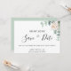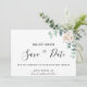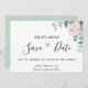 A modern Save the Date card for a wedding. A chic white background decorated with green watercolored eucalyptus greenery, leaves and sprigs and a watercolored white peony, flower floral. Personalize and add your names, the date and place of the venue. Black coloured letters. The text: Save the Date is written with a large trendy hand lettered style script.