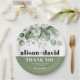 Cette plaque en papier mariage présente une belle branche d'eucalyptus ornée de fleurs blanches délicates et d'une végétation luxuriante. Les noms du couple sont affichés audacieusement dans une typographie élégante, accompagnée du message sincère "Merci". Ajoutant une touche d'élégance, il y a une bande verte sage qui est placée gracieusement en bas, complétant le design général.