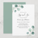 Elegant gender neutral Sip and See invitation with a simple design featuring watercolor painted eucalyptus greenery in the upper left corner and lower right corner. The backside is a matching shade of medium sage green. This rustic botanical Sip and See invitation with a modern twist is great whether it's for a baby boy or baby girl.