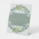 Wedding sign for the guest book table. The botanical design has blue-grey eucalyptus leaves. A swag of greenery at the top and bottom with a pale green panel in the centre for text. The watercolor leaves work for a rustic or nature themed wedding ceremony. This is one of many sizes to choose from.