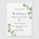 A white background decorated with eucalyptus greenery sprigs. Personalize and your name and ceremony details. Black coloured letters.
