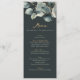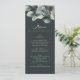 This elegant menu table card features a stylish design with “Menu” written in a refined gold script, complemented by the couple’s names and wedding date beneath in a light serif font. Each course title is beautifully displayed in the same gold script, with the dish details following in a sophisticated, minimalist serif font. Adorned with delicate eucalyptus leaves against a dark green background, this card adds a luxurious, nature-inspired touch to the dining experience. Perfect for weddings, receptions, or special celebrations, this menu card blends modern botanical elements with a sleek and timeless design.