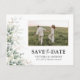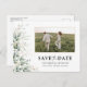 Eucalyptus Enregistrer la date avec carte postale photo. Cette carte postale élégante et élégante à enregistrer la date présente de magnifiques aquarelles peintes à la main Eucalyptus Leaf Greenery. Trouvez les articles correspondants dans la collection de verdure de l'Eucalyptus Aquarelle.
