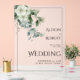 Bienvenue à vos invités mariages avec ce joli panneau acrylique transparent et dépoli, orné de branches d'eucalyptus, de fleurs blanches et de feuilles sauge dans le coin supérieur gauche, le tout encadré par une délicate bordure noire. Le joli design floral, combiné à une typographie charmante, accueille chaleureusement chacun pour participer à la célébration de votre journée spéciale.