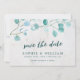 Cette sauvegarde de la date présente des feuilles eucalyptus avec les mots "enregistrer la date" dans le script tendance tout contre un arrière - plan en marbre clair sur le devant et une couleur vert foncé turquoise côté arrière. Personnalisez-le en remplaçant le texte de l'espace réservé. Pour plus d'options comme changer la police, sa taille et l'espacement entre les lettres cliquez sur le bouton "Personnaliser". *Veuillez noter que le filigrane Zazzle qui apparaît dans l'aperçu du zoom n'apparaîtra PAS sur le produit imprimé final. © Bois de rose et agrumes