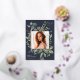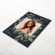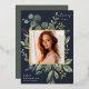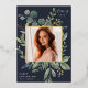 Notre faire-part de graduation Eucalyptus & Sage encadre une photo de votre diplômé avec une bordure carré élégante d'eucalyptus couleur d'eau luxuriante et de feuilles verts sauge, avec de véritables garnitures en feuille d'or sur un arrière - plan bleu marine de minuit. Personnalisez avec l'année de classe, le nom et l'école de votre diplômé. Ajoutez un message personnel à l'arrière, ainsi qu'une photo supplémentaire.