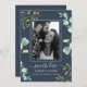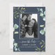 Elegant, simple photo wedding save the date invitation with green eucalyptus botanical design on a chic navy blue background you can customize with your engagement photo. Simply add your upcoming wedding details. If you need any help or matching products, please contact us through our store. We're happy to help you make your wedding the most beautiful day!