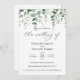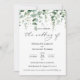 This design features a watercolor illustration of eucalyptus leaves with greenish and golden effect confetti on the top.