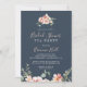This eucalyptus garden floral bridal shower tea party invitation is perfect for a modern wedding shower. The design features pink, blush, yellow rose flowers with eucalyptus leaves in a dark navy blue background.