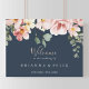 Cette enseigne d'accueil à la rose fleurie du jardin d'eucalyptus est parfaite pour un mariage rustique. Le design est composé de fleurs rose, blush, jaune rose avec des feuilles d'eucalyptus dans un arrière - plan bleu marine foncé. Faites de cette affiche votre propre en ajoutant le nom de la mariée et du marié, ainsi que la date du mariage.