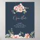This eucalyptus garden rose floral wedding open bar poster is perfect for a rustic wedding. The design features pink, blush, yellow rose flowers with eucalyptus leaves in a dark navy blue background.