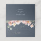 This eucalyptus garden rose floral wedding place card is perfect for a rustic wedding. The design features pink, blush, yellow rose flowers with eucalyptus leaves in a dark navy blue background.