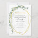 Trendy geometric eucalyptus greenery 50th wedding anniversary invitation with gold geometric frame and gold watercolor wash reverse.