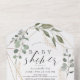 This elegant watercolor baby shower all in one invitation features a white background with eucalyptus and faux gold leaves framed by a faux gold geometric frame. It includes a book request. Personalize it for your needs. You can find matching products at my store.