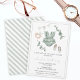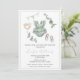 Elegant bohemian baby girl shower invitation card postcard featuring watercolor green eucalyptus and cute baby clothes, toys.