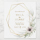 This eucalyptus gold geometric wedding wine label is perfect for your elegant boho wedding. It is designed with simple bohemian white and purple anemone flowers, simplistic watercolor sage green leaves, and modern gold foil winter frames. With the combination of white floral and simple rustic greenery, you're sure to create the atmosphere of your dreams.