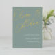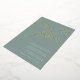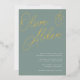 A beautiful typography based wedding invitation featuring your names in oversized gold foil script lettering at the top. Personalize with your wedding details in classic serif lettering aligned at the lower right. Our Eucalyptus colorway is an elegant mix of dusty greens, featuring pale green and white lettering on a sage green background.