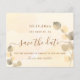 A golden watercolored background decorated with golden eucalyptus foliage. Personalize and add the date, place and your names. Golden coloured letters. The text: Save the Date is written with a large trendy hand lettered style script.