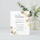 A modern, elegant, wedding program, timeline. White background, decorated with golden eucalyptus, sprigs. Personalize and add your names and wedding details. Black colored letters. If you have more text it's possible to reduce the line space and also add text on the back.