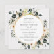 Elegant Wedding invitation featuring a gold wreath surrounded by elegant eucalyptus leaves and ivory flowers. Personalize with your information or click "Click to customize further" to edit font styles, size and colours.