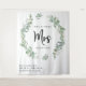 An elegant photo booth backdrop tapestry for your bridal shower featuring a sage green watercolor wreath of eucalyptus greenery and "The Future Mrs" in a large script and modern typography. Personalize with the bride's married and first names and shower date. A bottom corner is left blank for an area for your guests to take pictures.