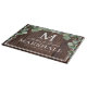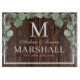 Rustic dark brown wood with eucalyptus greenery cutting board with the couples first names, last name monogram, full last name, and wedding date available in customizable templates. A cute country barbecue themed gift to help celebrate a summer wedding cookout.