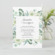 This elegant wedding invitation features a thick border of lush greenery, eucalyptse and flowers. The design is accented with handwritten style text for the names of the bride and groom.
