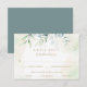 Elegant wedding meal choice RSVP card featuring eucalyptus leaves and greenery with a hint of blue and speckles of faux gold glitter at the top. Below is a template that has entree options for your guests to choose from, in a gold tone, over a pastel watercolor wash. The backside is a matching shade of soft blue green. This simple, rustic design is great for a botanical themed wedding in the summer. Optional white envelopes are INCLUDED.