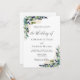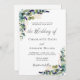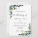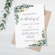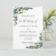 A white background decorated with watercolored eucalyptus greenery, lavender florals and golden foliage. Personalize and add your names and wedding details.